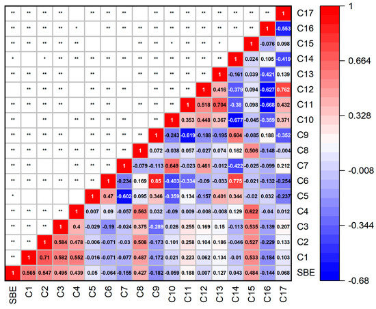 Correlation heat map. Note: Significance levels: “**” ≤ 0.001,“*” ≤ 0.05.