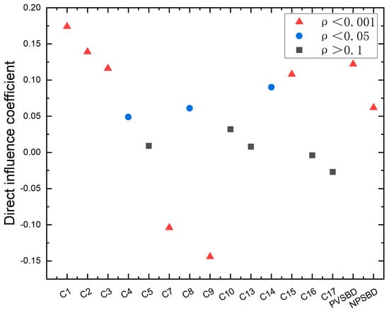 The R2 test was conducted in this study and the R2 value was 0.45, indicating that the model possesses good predictive accuracy. In the mediation model, it was first tested whether the direct relationship between landscape indicators and scenic beauty was moderated by the mediation effect of positive/negative viewpoint scenic beauty. The structural equation model performs the mediation effect analysis in several steps: in the first stage, it assesses the direct effect, i.e., the direct effect of landscape indicators on scene beauty perception (OSBSP), and the direct effect of positive/negative viewpoint of scenic beauty perception on OSBSP, while excluding the mediation effect between both landscape indicators and OSBSP. As the data in Table 4 show, the path coefficients between the nine landscape indicators C1, C2, C3, C4, C7, C8, C9, C14, and C15 and OSBSP are significant, indicating that the indicator variables consisting of 14 indicators have an extremely strong direct effect on OSBSP, supporting research hypothesis H1. The path coefficients between positive and negative viewpoints of scenic beauty perception and OSBSP are significant, and the path coefficients of positive viewpoint scenic beauty perceptions (PVSBP) were greater than negative viewpoint scenic beauty perceptions (NVSBP), indicating that the direct influence of PVSBP on OSBSP was greater, thus supporting research hypothesis H2.