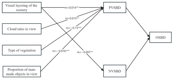Mediating effect results affecting the OSBS. Note: Significance levels: *** ρ ≤ 0.001, ** ρ ≤ 0.05. m means indirect effect coefficient. OSBD means SBE value of the scene; PVSBD means SBE value of the positive viewpoint; NVSBD means SBE value of the negative viewpoint.