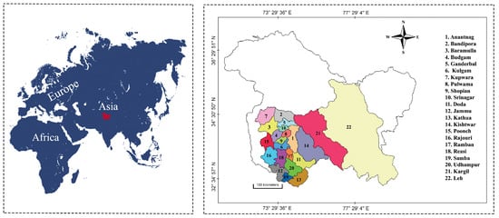 The present study intends to investigate the characteristics of agricultural growth in relationship with various intrinsic/extrinsic variables and assess the vulnerability of agriculture to climatic change in the region of Jammu, Kashmir, and Ladakh. This study area is situated in the northwestern portion of the Himalayan mountain range, characterised by significant variations in terrain elevation, snow-covered peaks, river systems, intricate geological formations, and diverse temperate plant and animal life. The studied area is centrally proximal to three climatic systems of Asia. The region of Punjab, characterised by a weak monsoon zone, is located in its southern border. It is bordered by the vast arid plateau of Tibet in its northeast. In contrast, the northwest border areas face the eastern limits of the Mediterranean climate. Two-thirds (2.3 million ha) of the total mountainous area of India (3.5 million ha) is found in this region. This region lies in the extreme north of the Himalayas. It constitutes about 67.5% of the northwest Himalayan region. There is diversity in the region’s agro-climatic conditions, ranging from temperate in Kashmir, cold arid in Ladakh, and sub-tropical in Jammu. However, the shift in micro-climatic scenarios varies widely across the whole area. A geographical outline of the area under study spans on a net area of about 101,387 km segregated into 22 sub-regions/districts (as shown in Figure 1).