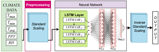 Now, the climate variables represent individual time-series signals with distinct temporal distribution. LSTM model is viable for capturing such temporal features having long-range dependencies. Initially, the dataset is treated with standard scaling to mitigate inter-year fluctuations, the removal of noise, and fasten the convergence of the applied model. Standard scaling is applied on each climate variable using the formulation in Equation (8).