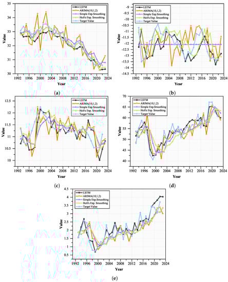 Variability and forecasting for studied climate variables. (a) (b) (c) (d) (e) .