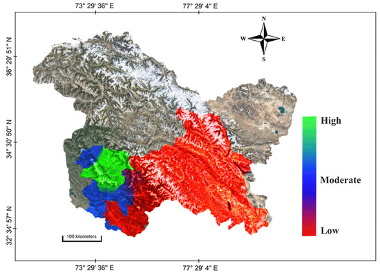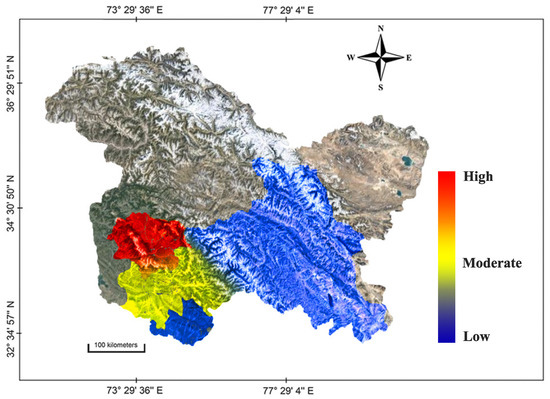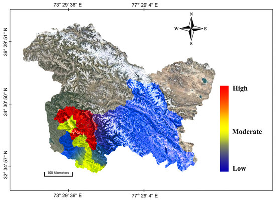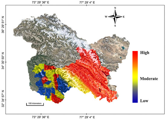 Due to commercialisation and urbanisation, land holdings () have shrunk across the region. On such terrain, basic agricultural activities are undesirable, and it renders stakeholders susceptible to climate change. The average landholding has been decreasing over the years, exhibiting a ha difference since 1983. The magnitude of sensitivity of an area is directly proportional to its area under culturable waste lands (), and it is reported to show a decreasing trend. The premise of increasing freshwater scarcity [83] poses a threat to the populace that depends on water-demanding food crops (such as rice [84]). The quantity of the area utilized for such an agricultural product along with the associated population are, thus, susceptible. In the extension to this context, any long-term change in climate would impress an impact on the hydrological regimes of an area with consequent effects on its irrigation system, making water-dependent crops even more sensitive. We witnessed an increase in the gross irrigated area () and net irrigated area () with district Leh having the largest area under its influence. We also observed that the principal food crops in Jammu and Kashmir followed a decreasing trend since 1983. Rice acreage is declining due to the large-scale conversion of the area into commercial, residential, and horticultural fields (particularly apple orchards). Although the irrigation system of apple is less complex, meeting the requirements of sufficient chilling hours is essential for its sustainability. A long-term increase in threatens apple production. We proceed to quantify the illiteracy rate () as a parameter of sensitivity because it poses a hurdle in establishing mitigation measures and promoting awareness. Since the districts of Jammu, Kashmir and Ladakh largely qualify as socially suburban, all of the districts have average illiteracy rates (with district Budgam reporting the highest illiteracy rate). Illiteracy is also an indirect indicator of unemployment and poverty scenario in the district. Owing to all these factors, climate stress affects the populace that entirely depends on its agricultural footprint. However, we report a declining percentage of agricultural workers () but an increasing percentage of agricultural labourers (), with the highest percentage increase in district Kargil. Lastly, we analyse the role of population characteristics with the objective of specifying the sensitivity of the area. In densely populated areas, the distribution and availability of natural resources such as water, food, and energy become more challenging. Dense populations are more susceptible to the spread of climate-related diseases. In addition, social vulnerability can be higher in densely populated areas, as these communities often face challenges in accessing resources, services, and timely emergency response during climatic catastrophes. A region’s sensitivity is also measured in terms of its BPL population (), both are positively correlated because of lower access to strategic resources. It was observed that the Srinagar district, followed by Bandipora, has the highest population density () while district Leh has the least. In this framework, Figure 6 illustrates a heatmap representation of the studied area to quantify its district-wise sensitivity to climate variability.