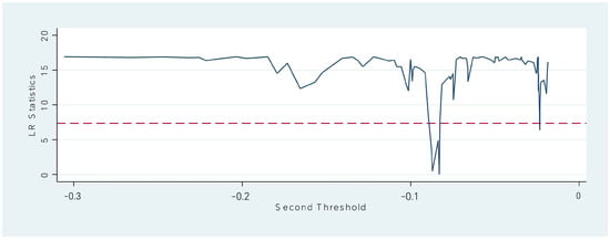 The F-statistic tests of the single-threshold and dual-threshold models for market competition are shown in Table 6. The results show that the p-value of the single-threshold test is 0.070, and the p-value of the dual-threshold effect test is 0.087. Both pass the 10% significance level, while the p-value of the triple-threshold effect test does not pass the significance level. This indicates a dual-threshold effect based on market competition between DF and technological innovation, with threshold values of −0.083 and −0.028. Hypothesis 3 is validated. Figure 1 shows the forming process of the confidence intervals and threshold figures. Based on the determination of threshold values and threshold models, Table 6 shows the regression results with market competition as the threshold variable. It can be seen that when market competition is less than the first threshold value of −0.083, the coefficient of DF is 0.158, passing the significance level of 1%. When market competition is greater than −0.083 but less than −0.028, the DF coefficient is 0.135, which is significant at the 1% level. When market competition exceeds −0.028, the coefficient of DF is 0.110. As market competition gradually deepens, the promotion effect of DF on technological innovation becomes weaker. Intense competition may cause manufacturing enterprises to face more uncertain situations, thereby increasing the difficulty of predicting and implementing innovative projects. The increase in raw material costs brought on by competition squeezes the profit space that enterprises can obtain. It also reduces internally available surplus, enhances the preventive cash incentives of enterprises, and weakens innovation enthusiasm (Table 7).