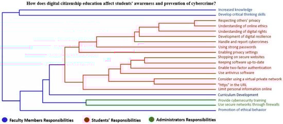 Digital citizenship education has a significant impact on students’ awareness and prevention of cybercrime through the development of responsible online behavior and critical thinking skills. The specific objectives of this interview were to explore participants’ experiences and perspectives on digital citizenship and cybercrime prevention and gain a deeper understanding of how participants navigate digital spaces and engage in digital citizenship practices. Moreover, this interview provides a comprehensive understanding of digital citizenship and cybercrime prevention by integrating qualitative and quantitative data. In order to confirm this hypothesis, an interview was conducted online via Zoom with 64 students. We asked them about how digital citizenship education affects students’ awareness and prevention of cybercrime, and what strategies can be employed by higher education institutions to promote digital citizenship and prevent cybercrime? Qualitative data from the interviews were subjected to thematic analysis to identify common themes and patterns, as presented in Figure 2.