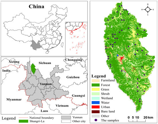 Shangri-La is located between 99°20′~100°19′ E longitude and 26°52′~28°52′ N latitude at the confluence area of the Yunnan Province, the Sichuan Province, and the Tibet Autonomous Region. It lies in the northwestern part of the Yunnan Province, in the hinterland of the Hengduan Mountains on the southeastern edge of the Qinghai-Tibet Plateau. Its topography is undulating, with the lowest point is located in Luoji Township at 1503 meters, and the highest point located in the Balagzong Snow Mountain in Nixi Town at an altitude of 5545 meters. Due to it being located in a high altitude and low latitude area, the climate changes with the increase in altitude [22]. It encompasses six climate zones: the North subtropical valley, mountain warm temperate zone, mountain temperate zone, mountain cold temperate zone, high mountain subfrigid zone, and Alpine frigid zone. With 89.75 hectares of forest area and 78.6% of forest cover, Shangri-La is known for its dense forest cover. The primary wood species found in this region are Quercus aquifolioides, Picea likiangensis, Abies georgei, Pinus densata, and Pinus yunnanensis [23]. Figure 1 provides additional regional information about Shangri-La. Shangri-La has abundant forest resources. Quercus aquifolioides is one of the main dominant tree species, which is widely distributed and has a significant effect on the carbon balance in the region. Further, because the region is located on the edge of the Qinghai-Tibet Plateau, it has steep mountains, deep valleys, and the terrain is undulating. It is much challenging to accurately estimate forest carbon storage.