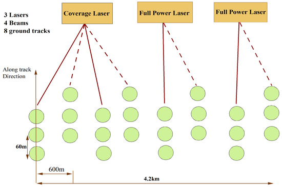 The GEDI instrument, which is attached to the International Space Station (ISS), collects data globally between latitudes of 51.6° north and 51.6° south latitude. This data represent the highest resolution and largest sampling density in on-orbit optical detection and LiDAR instruments data [26]. The main objective is to enhance our ability to describe the impacts of climate change and land use on ecosystem structure and dynamics. The GEDI instrument consists of three lasers that are splitting and beam jittering, producing eight beam ground cross-sections at 600 meter intervals in the cross-orbit direction of the Earth’s surface. Each beam has footprint samples with a diameter of approximately 25 meters and an interval of about 60 meters along the track, covering a width of about 4.2 kilometers across the track [27]. Figure 2 illustrates the GEDI beam sampling mode [26]. This study used GEDI-derived Level 2B (L2B) data; it included eight beams and one metadata. The metadata contains comprehensive information, such as acquisition time, purpose, file name, and creation time. Additionally, each beam contains a total of one hundred and fifty-six fields that encompassed geographic location, land cover data, and more.