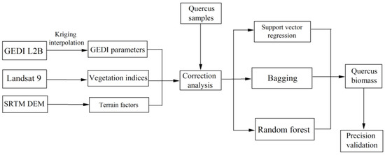 In the early stage of this study, surface information was obtained using the Kriging interpolation method to interpolate the footprint parameters provided by GEDI. Then, the Landsat 9 image was coordinated with the GEDI parameters to analyze the correlation between each variable and carbon storage. And then, we used support vector machine, bagging regression, and random forest to build the carbon storage assessment model. The primary purposes of this analysis are as follows: (1) Finding the optimal semi-variance model of GEDI metrics. (2) Analyzing the correlation between vegetation indices and GEDI metrics and Quercus aquifolioides carbon storage. (3) Developing carbon storage estimation models and exploring the influence of explanatory variables on the accuracy of carbon storage estimation. (4) Estimating the carbon storage of Quercus aquifolioides and discussing its distribution characteristics on different slopes and aspects. The main steps can be seen in the technology roadmap (Figure 4).