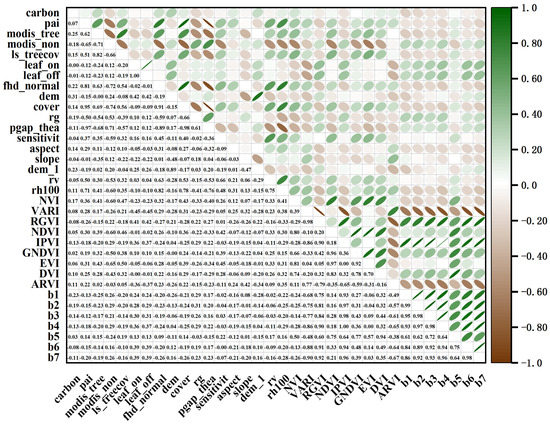 To analyze the interaction between different remote sensing characteristics and Quercus aquifolioides carbon storage as well as to compare the estimation accuracy of different regression models, Pearson correlation analysis was carried out between the remote sensing characteristic factors extracted from GEDI and Landsat 9 images and the Quercus aquifolioides carbon storage in the sample sites using R software. The correlation coefficient matrix was displayed in Figure 5. The Pearson correlation coefficient between remote sensing variables and carbon storage ranged from −0.228 to 0.307, with five variables significantly associated with carbon storage (p < 0.05). Among these variables, digital_elevation_model, modis_treecover, dem, fhd_normal, and B1 had the highest correlation coefficients with carbon storage (0.307, 0.254, 0.234, −0.228, and 0.217, respectively).