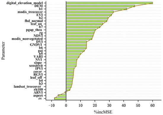 The importance of each variable was ranked via random forest (Figure 6). The brown line is the connecting line of the %incMSE value of each variable. Because % IncMSE is verified by OOB data, and the reliability of feature selection is high. Therefore, this paper chose the results of % IncMSE for feature selection. By combing Pearson correlation analysis, the characteristic variables that were significantly correlated at the 0.05 level were screened. Finally, six characteristic variables of digital_elevation_model, DEM, EVI, B1, modis_treecover, and fhd_normal were selected as the modeling factors.