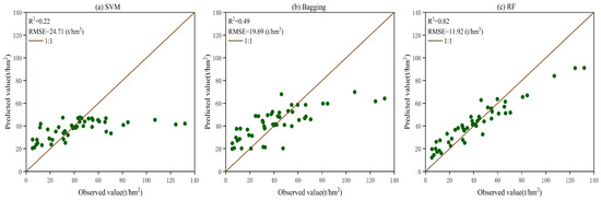 The appropriate combination of independent variables derived from GEDI L2B spaceborne LiDAR data and Landsat 9 remote sensing images was selected by screening individual factors using random forest and Pearson correlation coefficient analysis. Model building for the selected variables and observed carbon storage was conducted using SVM, bagging, and RF, and the accuracy of each model was evaluated. Two indicators, R2 and RMSE, were used to compare and analyze the prediction outcomes of various models, and the findings are presented in Figure 7a–c.