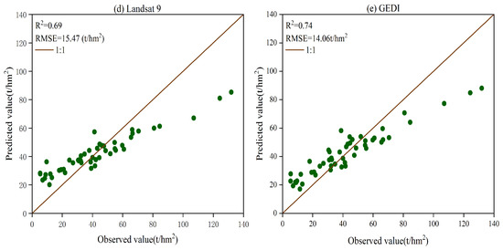 A common limitation of optimal sensors is that they cannot accurately capture changes in aboveground biomass and carbon storage. They can measure three-dimensional forest structure, but cannot obtain three-dimensional forest structure information. In this study, GEE was used to acquire pre-processed Landsat 9 images. Images with less than 2% cloud cover in the vegetation growing season (March to May) in 2022 were obtained. Previous studies have shown that the application of different feature combinations can effectively avoid the loss of information caused when using a single variable model and it also can determine the range of AGB saturation points based on different data [45]. To analyze the influence of different variables selection on carbon storage estimation results, we conducted a feature optimization of variables extracted from the GEDI and Landsat 9 images, as seen in Figure 7d,e. The estimation results of this study were similar to Jiao’s (who used regression with log transformations model to integrate the Sentinel-2 and GEDI image feature variables, wherein the estimated R2 was 0.72 and the RMSE was 17.93 t/hm2) [46]. The results illustrated that the accuracy of carbon storage inversion using optical images or spaceborne LiDAR variables alone was lower than that of estimation by integrating multiple data sources.
