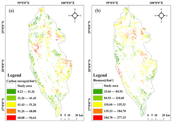 (a) is the distribution of estimated carbon storage of Quercus aquifolioides in Shangri-La; (b) is the biomass distribution of Quercus aquifolioides.