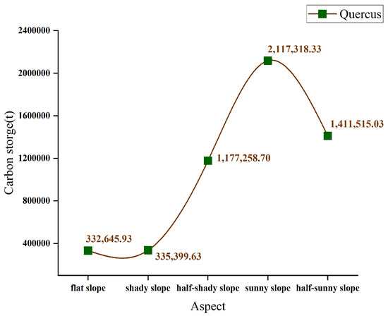 After model estimation, we found that the overall carbon storage of Quercus aquifolioides in Shangri-La was 5,374,137.62 t, and the average value was 42.44 t/hm2. After classifying the distribution area of Quercus aquifolioides in Shangri-La, we divided the study area into flat (0°), east (67.5~112.5°), southeast (112.5~157.5°), south (157.5~202.5°), southwest (202.5~247.5°), west (247.5~292.5°), northwest (292.5~337.5°), north (0~22.5°, 337.5~360°), and northeast (22.5~67.5°), which represented flat, half-shady slope, half-sunny slope, sunny slope, sunny slope, half-sunny slope, half-shady slope, shady slope, and shady slope, respectively. The spatial analysis method was used to extract the carbon storage of Quercus aquifolioides on different aspects and slopes in ArcGIS 10.2. The carbon storage of Quercus aquifolioides on different aspects is shown in Figure 9. It was observed that carbon storage was predominantly distributed in the sunny slope, which was 2,117,318.33 t, and it accounted for 39.43% of the total area. Next, the amount of the half-sunny was 1,411,515.03 t which contained about 26.29% of the carbon storage in Shangri-La, and distribution in flat slope was the least, which was 332,645.93 t, just accounting for only 6.19% of all carbon storage. Overall, the distribution pattern of Quercus carbon storage in Shangri-La followed the sequence of sunny slope, half-sunny slope, half-shady slope, and shady slope. This pattern was consistent with the characteristics of Quercus aquifolioides forests in Yunnan, Guizhou, Sichuan, and Tibet, which were mainly found on mountain slopes at altitudes of 2000~4500 m with abundant sunlight.