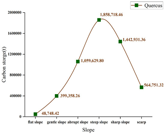 According to organized survey data, the study area was divided into flat slope (<5°), gentle slope (5~15°), abrupt slope (15~25°), steep slope (25~35°), sharp slope (35~45°) and scarp (>45°). As shown in Figure 10, the carbon storage of Quercus aquifolioides in the flat slope was the lowest, which was 48,748.42 t, accounting for only 0.91% of the total Quercus aquifolioides carbon storage. But the value in the steep slope was 1,858,718.46 t; it was the largest compared with other slopes, which was about 34.59% of all carbon storage. And the second highest was the sharp slopes, with 26.85% of the total value. In general, the distribution pattern of Quercus carbon storage in Shangri-La followed the sequence of the steep slope, sharp slope, abrupt slope, scarp, gentle slope, and flat slope. Furthermore, the altitude of Shangri-La Quercus aquifolioides ranged from 1451 to 5314 meters. Previous studies have shown that Quercus aquifolioides was most abundant at altitudes of 2500 m to 3000 m, reaching up to 93.75% of the total area. The carbon storage of Shangri-La Quercus aquifolioides was mainly concentrated in high-altitude areas, with the highest values observed on steep slopes and sharp slopes. This distribution pattern aligned with the characteristics of higher altitudes and steeper slopes.