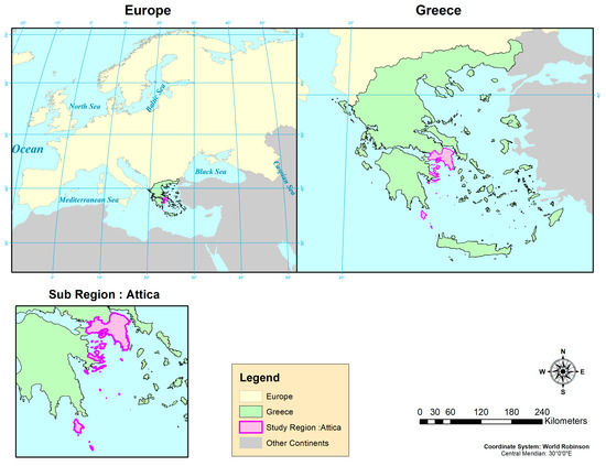 The study areas include the entire country for the first part of the methodology and the region of Attica for the second part (Figure 1). The Greek climate, being classified as a Mediterranean ecosystem, exhibits dry winters, with water shortages during the annual cycle [46]. The climate ranges from continental Mediterranean on the northern part to subtropical in the southernmost edges of the country, with intense shifts from one category to the other being noticed from the continental toward the coastal parts of the country [47]. The increased climatic variability noted in the Greek domain can be mainly attributed to the effects of topography and aerial masses coming from the central part of the Mediterranean. As a result, the western part of the country tends to be wetter, while the eastern part is hotter and drier. It has been observed that in Mediterranean ecosystems, climate variability is the leading factor regarding wildfire seasonality and fuel layer flammability [48]. Increased fuel flammability due to prolonged drought and higher overall temperatures is considered one of the main ecosystem responses to climate change [49].
