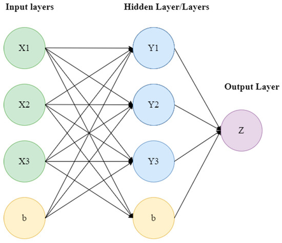 Schematic representation of the function of an ANN. The input layer (X) feeds—along with its bias—the hidden layers that produce a result and consecutively propagates it to the next layers until the final output layer.