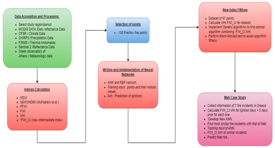 A total of 100 random points within the study region were selected and were then split into categories (fire and no fire). Each point had 13 attributes (i.e., minimum, median and maximum values of all the mentioned indices as well as the number of ignitions). Two types of neural networks, an Artificial Neural Network (ANN) and a Radial Basis Function (RBF) network, were constructed for fire prediction using as input the index values of these points.