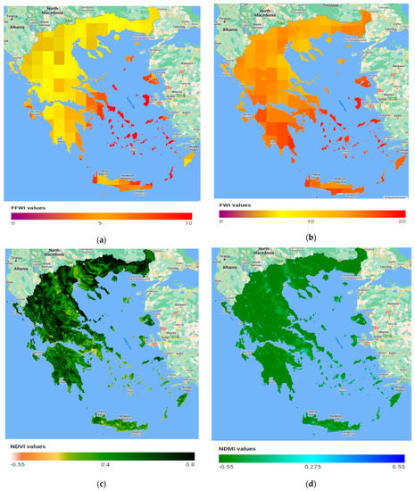 Representation of the indices calculated in GEE to be used as input values for the neural networks for the study region of Greece, FFWI (a), FWI (b), NDVI (c), NDMI (d). The indices FWI, FFWI present a similar spatial distribution pattern, concentrating their higher values on the hot and dry south-eastern part of the country. NDVI and NDMI values have been limited within the range displayed in the legends to better depict contrast and value variations within the study region.