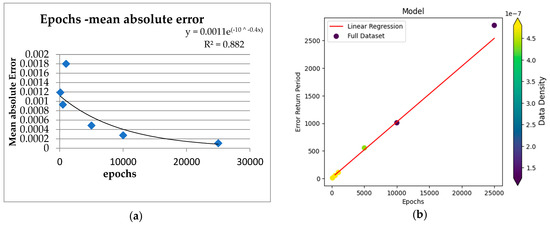 The TMAE was proven to exhibit a linear dependence on the epoch number with a proportional increasing trend, with an R2 = 0.99, p < 0.05 and a slope of 1.04 (Figure 5b). The values of the TMAE for the epoch numbers (100, 500, 1000, 5000, 10,000, 25,000) were 9, 53, 109, 553, 1009 and 2775 epochs, respectively.