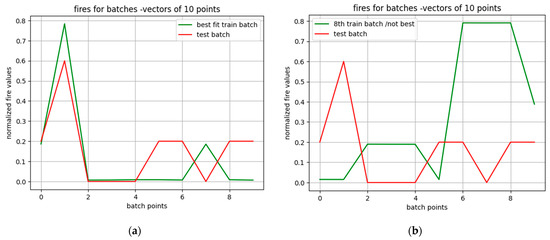 Comparison of similarity of ignition curves, meaning actual number of ignitions (red line) and predicted number of ignitions (green line), with the predicted one from the parameters of the corresponding train batch. Chart (a) depicts predictions made using the parameters (w,b) of the 4th optimal batch, while chart (b) corresponds to predictions made using parameters of a non-optimal batch (8th). The y-axis corresponds to the number of ignitions Y after being divided by its maximum value (5); hence, to obtain the true ignitions for each point, the y-values of the curves have to be multiplied by 5.