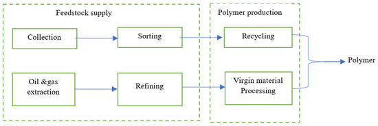 Virgin polymers are produced from fossil fuels and their derivatives, which are extracted and transported to refineries. At refineries, the fossil fuels are processed into naphtha, which is used as feedstock for polymer manufacturing. The feedstocks are then converted into other intermediate products and monomers that are used to make different types of polymers through polymerisation. Finally, the polymers are formed into pellets or semi-finished products and transported to their destinations. All these steps contribute to the production of virgin polymers [33].