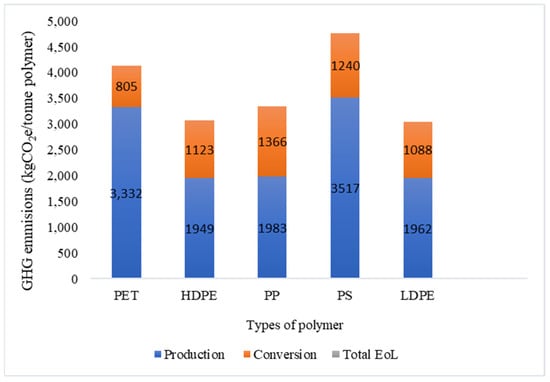 Conventional (fossil fuel-based) plastics emitted 1.8 GtCO2e in 2015 over their life cycle, which is 3.8% of the GHG emitted globally in the same year, 47 GtCO2e [40]. In this study, we focused only on the widely used polymer types and the life cycle GHG emission was estimated to be 20.7 GtCO2e/year. The production stage greatly contributed to the emission (61%), followed by the conversion stage (30%), the rest being contributed by end-of-life (EoL) management facilities. Among the polymers, polystyrene contributed the highest followed by polyethylene (Figure 2).