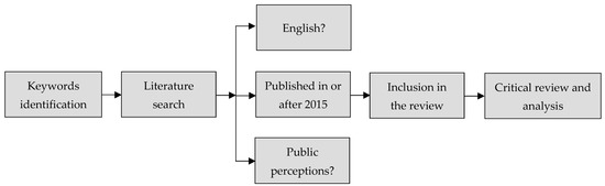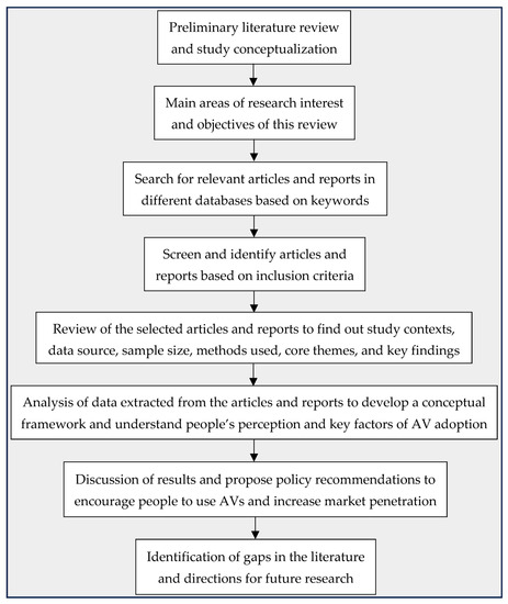 This state-of-the-art literature review is conducted to identify, evaluate, and critically analyze relevant scholarship in order to understand people’s perceptions and opinions about AVs and to identify the factors that influence AV adoption. The overall study approach is illustrated in Figure 2. First, a scan of the literature was conducted to select published articles and reports to be included in the review process. Based on the initial literature search, some keywords (e.g., autonomous vehicle, connected and autonomous vehicle, self-driving car, driverless car, public perceptions, opinions, willingness, attitude, opportunities, and challenges) were used as search terms to identify relevant articles. Widely used databases, such as ScienceDirect, Scopus, SAGE Journals, SpringerLink, Taylor and Francis, and Web of Science, Google Scholar, and the websites of different organizations, are the main platforms we used to identify articles and reports suitable for inclusion in the review process. Items were selected based on these additional criteria: