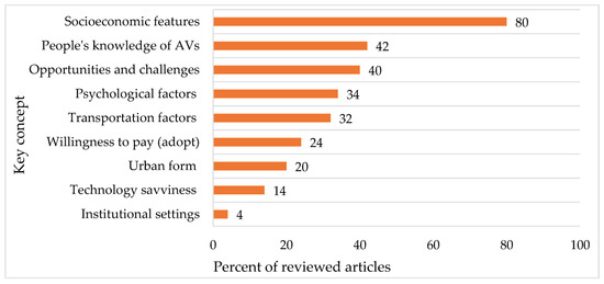 The core themes discussed in the reviewed papers are identified in Figure 3. The majority of studies (80%) collected socioeconomic information on the respondents and investigated their effects on the decision-making process with reference to the adoption of AVs. A considerable number of studies explored people’s awareness and knowledge of AVs and their features (42%) and opportunities and challenges (40%) towards the increase in AV market share. A nearly equal number of studies (34% and 32%) investigated the influence of psychological and transportation factors on AV adoption, respectively. About 24% of studies discussed people’s inclinations to adopt and use AVs. The influence of urban form (20%) and technology savviness (14%) on AV adoption was mentioned in a relatively small number of studies. The condition and effects of institutional settings were described by only 4% of studies. Considering the significant implications of psychological and socioeconomic attributes, transportation factors, urban form, technological innovations, and institutional regulations and guidelines in motivating people towards AVs, their detailed discussion in different study contexts with a diverse background of customers is crucial.