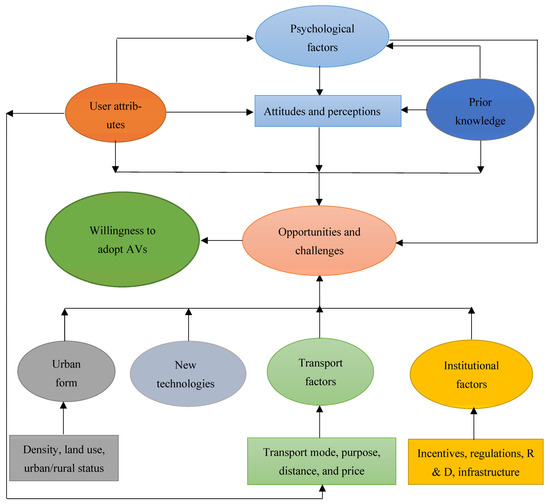 Considering the attitudes and perceptions of populations along with other factors, researchers have reported that many people would be interested in adopting the novel technologies embedded in AVs. These studies have applied various existing cognition and decision theories, such as TRA, TPB, and TAM [74,75,76], to conceptualize and understand the factors that influence people’s behavioral intention (BI) (i.e., willingness) to adopt AVs. According to these theories, human BI toward actual AV use is directly influenced by behavioral control factors (e.g., socioeconomic and travel factors), objective factors (i.e., urban form), and psychological factors (i.e., perceived usefulness and perceived ease of use). Additionally, these models indicate that the actual use of AVs also depends on the availability of novel technologies (e.g., EV, solar panel) and people’s affinities towards them. Socioeconomic factors also indirectly affect AV use by influencing objective factors, psychological factors, and the affinity of people towards technology.