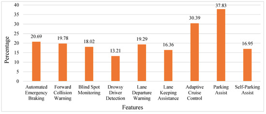Conducting a survey in eight European countries, Nordhoff, Louw [64] investigated the experience drivers had with different ADAS features. Collecting data from Nordhoff, Louw [64], we prepared Figure 5 and tried to understand the experience drivers had with different ADAS features. While features like parking assistance and adaptive cruise control are now increasingly common in vehicles, most drivers do not have any ADAS, but 47–64% of survey respondents expected to have them in their vehicles and use them in the future. Nevertheless, they have enough awareness of ADAS features to confirm their affinity towards advanced technology, which may translate into adoption in the near future.