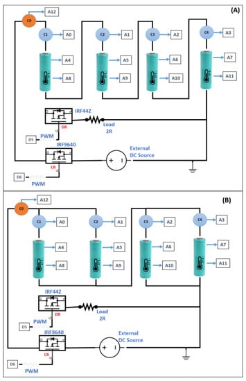 The voltage of each cell is measured by a resistor divisor and connected to the analog channel of BMS A4, A5, A6, and A7. Finally, the current signal is measured in different positions. According to Figure 1A, there is a single current sensor for each cell, and the extra current sensor C0 is considered from the actual sensor, while the C1, C2, C3, and C4 are the virtual sensors because they would not appear in a real case. Similarly, for the Figure 1) configuration, there is also an extra sensor named C0 that collects the current signature of the packing in the entry battery.