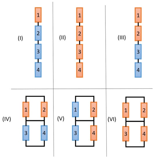 A mini-packing with four cells with different configurations has been built to introduce our proposal, as observed in Figure 1. In Figure 1A, the experiments were conducted with packing in a series configuration. In contrast, Figure 1B indicates a packing composed of two modules in a series, each with two cells in parallel.