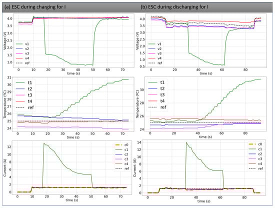 In general, for ESC abuses, the abuses may significantly increase the cell’s temperature independent of the configuration. The voltage sensor can also suggest a presence of an ESC in the packing. Nonetheless, the ESC is observed by current sensors if there are several sensors between the cells. In a real case, sensor C0 detects a soft variation during discharging due to the reduced energy available to supply the load but can not identify it during the charging process.