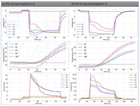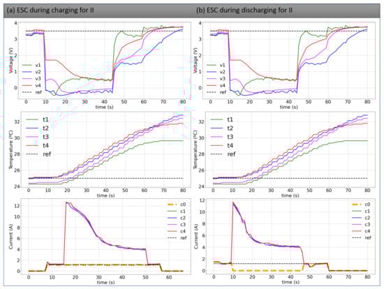 On the other side, Figure 7b indicates the main behaviors of ESC for configuration VI during the discharging process. The voltages in a normal experiment should be close to 3.8 V as observed by the reference. Although, the following voltages were observed: between 1 and 2 V for cells #3 and #4 and close to 0 V for cells #1 and #2 during the discharging.