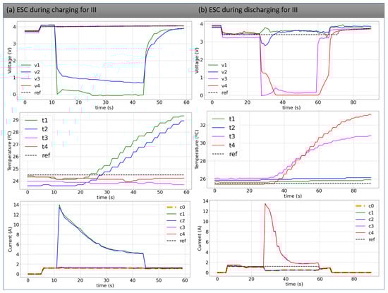 For configuration III, ESC abuse was applied in two series-connected cells. As observed in the last experiment, two tests were used: one during charging and the other during discharging.