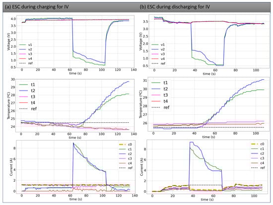 According to Figure 4a, the temperature of the four cells increased significantly, especially in cell #4. This effect can be explained by the voltage signature, in which cell #4 maintained the highest voltage of all cells during the ESC. A delta of about 7 °C was registered among the reference and the cell’s temperature, as observed in Figure 4a. The voltage of the other cells was close to 0 V during the abuse. In this way, if only one current sensor (C0) exists, verifying each cell’s voltage and temperature is necessary to identify this type of ESC.