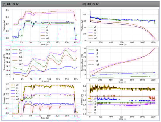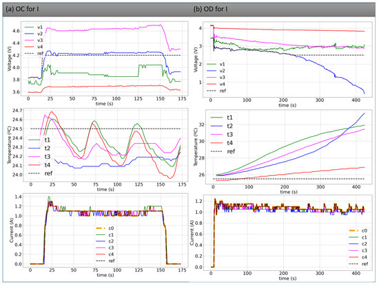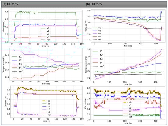 Additionally, Figure 9b indicates the experiments with OD for configuration IV. According to the picture, both voltages (cell #3 and #4) suffered from the abuse, and their voltages achieved values below 2 V (two minutes after the voltage of the first cell was below 2.5 V). During this failure, their temperature rose to about 30 °C, and the temperature of the other cells remained close to the controlled ambient (reference value). The study of Gotz et al. [] shows that the temperature increases more when the SOC decreases. Thus, as the voltage of cells #1 and #2 were above 3.5 V, their temperature remained close to the reference. Nothing could be observed in the current signature.