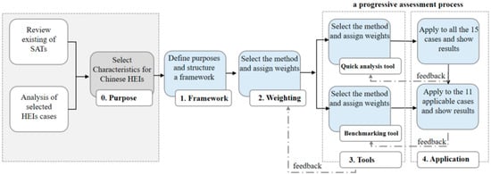 In order to create a sustainable assessment framework that was both leading campuses toward sustainability and more adaptable to the Beijing–Tianjin–Hebei local context, a mixed method was used. The design process was developed based on the review of SATs and considering the local contexts. The process goes as follows (Figure 1).