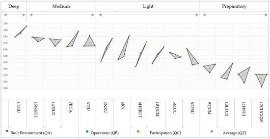 The percentage of the scores in dimensions are calculated (QA for the standardized Built Environment score, QB for the Operations, and QC for the Participation), and finally QZ is the average of the three and is used as the final score.