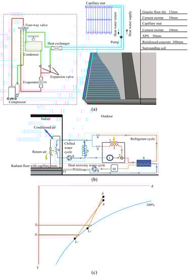 IAFS principle. (a) The principle of IAFS [36]. (b) Energy flow of IAFS. 1: compressor, 2: valve, 3: condenser, 4: expansion valve, 5: evaporator, 6: coil, 7: fan, 8: pump, 9: heat exchanger, 10: tank, 11: capillary mat layer; the solid lines are water cycle, and the imaginary line is refrigerant cycle. (c) Air handling process in IAFS: the x axis (d) is humidity, the y axis (T) is air temperature, and the blue curve is 100% relative humidity curve; A: indoor air state in CDS, : indoor air state in IAFS, : floor surface temperature in CDS, : floor surface temperature in IAFS, : air state of the outlet of CDS, : air state of the outlet of IAFS.