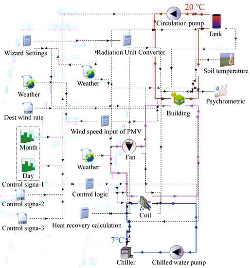 In this article, TRNSYS was only used for inter-system simulations and did not include the refrigeration cycle. The chilled water is set at 7 °C, and the evaporator temperature is approximately 4 °C.