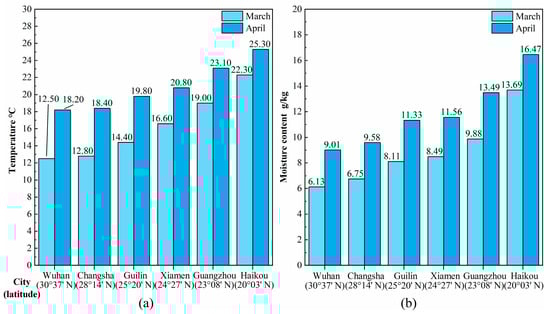 The Hu Huanyong Line divides China into two sections, the northwest and the southeast, with arid weather in the northwest and wet weather in the southeast [47]. Throughout the year, the climate in southern China is relatively humid. Figure 4 displays climate data for the representative cities of Guangzhou, Guilin, Haikou, Xiamen, Changsha, and Wuhan [48]. As the city’s latitude decreases, the mean monthly air temperature and air humidity increase. During the transitional season, particularly in March and April, frigid air from the north collides with warm and humid airflow from the south, causing temperature fluctuations and condensation on the surfaces of building envelopes (Figure 5). In China, this phenomenon is known as “Moistening Weather” [1].