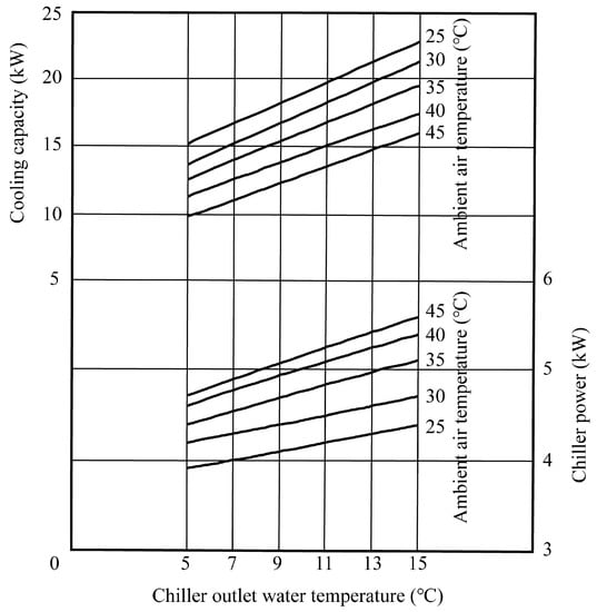 The performance correction curve for the selected chiller is shown in Figure 6. The outlet water temperature of the chiller and the ambient air temperature influence the cooling capacity and power of the chiller. In TRNSYS (Figure 2), the operating curve of the chiller is a normalized polynomial with ambient and outlet water temperatures as variables.