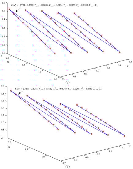 In Figure 7, the red stars are the pick points of Figure 6, and the thin blue line is the fitting curve used for the simulation. The X-axis represents the normalized ambient temperature value, the Y-axis represents the normalized outlet water temperature value, and the Z-axis represents the normalized CAP (COP) value.