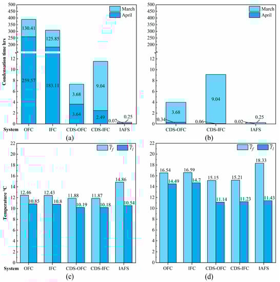 The IAFS had the best performance in condensation-proofing. The condensation time during the transitional season is only 15 min (Figure 8a).
