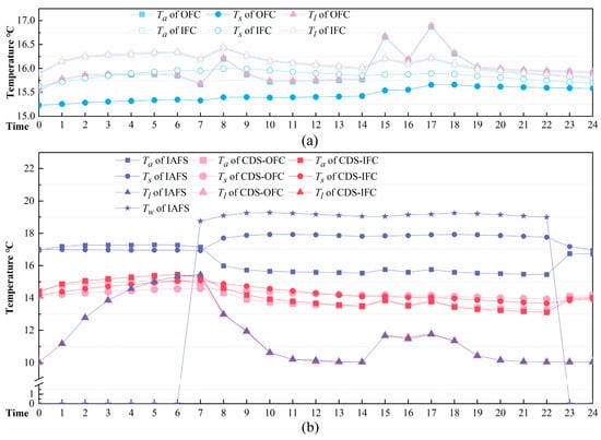 System simulation hourly results on April 2nd. (a) The hourly temperatures in OFC and IFC; (b) the hourly temperatures in CDS-OFC, CDS-IFC, and IAFS.