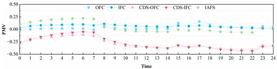 The performance on April 2nd is taken as an example to show the indoor comfort level in different situations, and the PMV index is used for evaluation. The ambient temperature fluctuates between 17 °C and 22 °C, and the humidity is approximately 13 g/kg on that day.