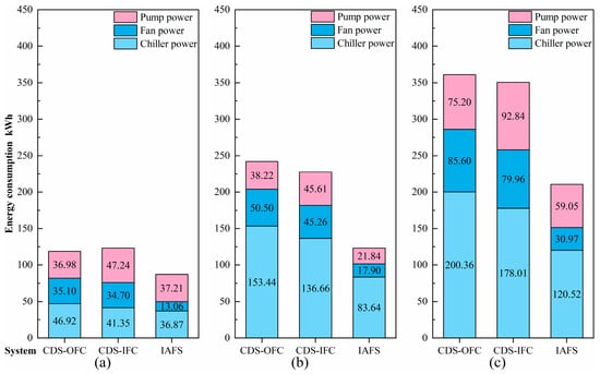 In addition, because the ambient temperature in March is lower than in April, the COP of the chiller appears to be greater, i.e., 6.14 in March and 4.92 in April for the CDS-OFC, 6.15 in March and 4.89 in April for the CDS-IFC, and 5.00 in March and 4.79 in April for the IAFS. This is another reason why the chiller’s energy consumption increases in April.