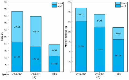 Both the CDS-OFC and IAFS are active dehumidification systems. Due to the heating floor in the IAFS, the floor surface temperature is 2.98 °C and 3.12 °C higher than that of the CDS-OFC in March and April, respectively, as well as the air dew-point temperature in the IAFS being slightly higher (Figure 8c,d).
